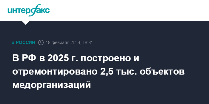 "В системе здравоохранения в 2025 году динамично шла работа с развитием инфраструктуры. Всего построено и отремонтировано в 2025 году 2,5 тыс. объектов медицинских организаций. Это включая и поликлиники, и стационары", - сказал Мурашко в среду на совещании с президентом России Владимиром Путиным.