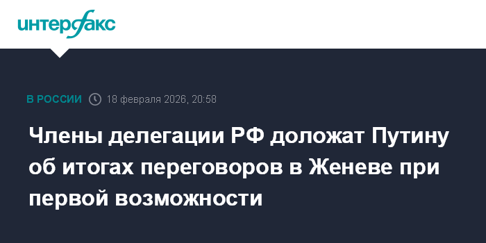 Москва. 18 февраля. INTERFAX.RU - Члены российской делегации на переговорах по украинскому урегулированию в Женеве доложат президенту РФ Владимиру Путину об их итогах при первой возможности, заявил пресс-секретарь главы государства Дмитрий Песков.