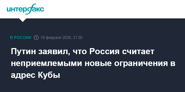 Москва. 18 февраля. INTERFAX.RU - Россия считает неприемлемыми новые ограничения в адрес Кубы, заявил президент РФ Владимир Путин.