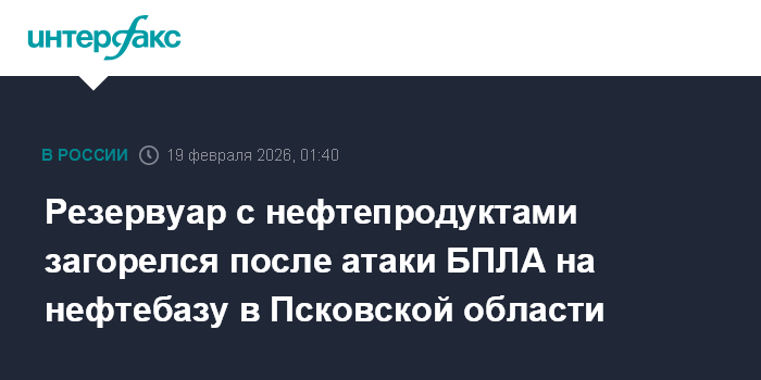 Москва. 19 февраля. INTERFAX.RU - Губернатор Псковской области Михаил Ведерников сообщил о пожаре на Великолукской нефтебазе в результате атаки БПЛА, предварительно, никто не пострадал.
