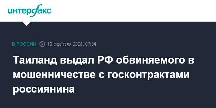Москва. 19 февраля. INTERFAX.RU - Таиланд выдал России обвиняемого в мошенничестве при реализации госконтракта по развитию оборонно-промышленного комплекса на сумму свыше 3 млрд рублей, сообщила официальный представитель МВД России Ирина Волк.