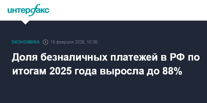 Москва. 19 февраля. INTERFAX.RU - Доля безналичных платежей в розничном обороте по итогам 2025 года выросла на 2,2 процентного пункта, до 88% с 85,8% в 2024 году, следует из данных ЦБ РФ.