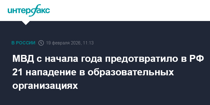Москва. 19 февраля. INTERFAX.RU - Сотрудники полиции с начала текущего года предотвратили 21 попытку нападений на учеников и учителей в образовательных организациях в 15 регионах страны, заявил глава министерства внутренних дел Владимир Колокольцев.