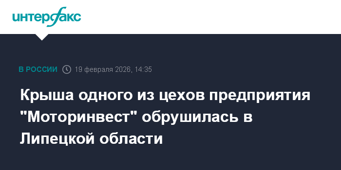 Москва. 19 февраля. INTERFAX.RU - Обрушилась крыша одного из цехов предприятия "Моторинвест" (выпускает в Липецке электромобили и гибриды Evolute), сообщил губернатор Липецкой области.