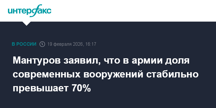 Москва. 19 февраля. INTERFAX.RU - Первый вице-премьер Денис Мантуров заявил, что доля современных образцов оружия и военной техники в российских Вооруженных силах превышает 70%.