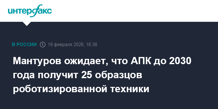 Москва. 19 февраля. INTERFAX.RU - Агропромышленный комплекс России до 2030 года может получить не менее 25 образцов современной техники с использованием искусственного интеллекта.