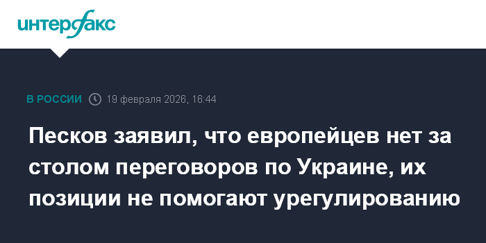 Москва. 19 февраля. INTERFAX.RU - Россия не видит смысла в участии европейцев в текущем переговорном процессе по Украине, большинство заявлений, звучащих от них, больше способствуют продолжению войны, чем мирному урегулированию, заявил пресс-секретарь президента РФ Дмитрий Песков.