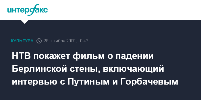 Москва. 28 октября. INTERFAX.RU - Телеканал НТВ 8 ноября покажет премьеру документального фильма о 20-й годовщине падения Берлинской стены, который включает интервью со свидетелями тех событий - экс-президентом СССР Михаилом Горбачевым, премьер-министром РФ Владимиром Путиным и бывшим президентом ФРГ Рихардом фон Вайцзеккером. В фильме, который создал журналист Владимир Кондратьев использованы уникальные архивные кадры, многие из которых российские зрители увидят впервые, в частности, хроника, подробно отражающая исторический момент поднятия шлагбаума на пограничном контрольно-пропускном пункте в стене. Глава российского правительства Владимир Путин в фильме делится своими воспоминаниями о тех событиях.
