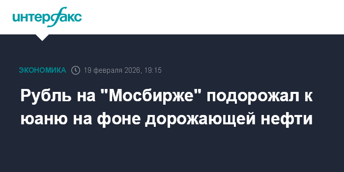 Москва. 19 февраля. INTERFAX.RU - В четверг на "Московской бирже" рубль подорожал к юаню вслед за растущими котировками нефти. Торги проходили при сниженной активности рынка. На этой неделе биржи Китая не работают в связи со встрече Нового года по лунному календарю.