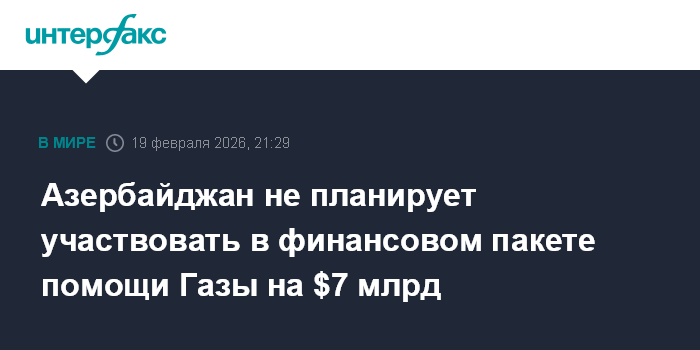 Москва. 19 февраля. INTERFAX.RU - Азербайджан не планирует участвовать в финансовом пакете помощи сектору Газа в рамках Совета мира на $7 млрд, сообщил в соцсетях помощник президента - заведующий отделом по вопросам внешней политики администрации президента Азербайджана Хикмет Гаджиев.