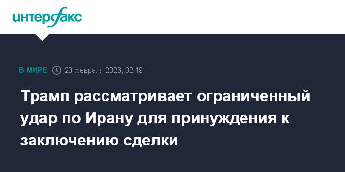 Москва. 20 февраля. INTERFAX.RU - Президент США Дональд Трамп рассматривает различные варианты действий в отношении Ирана, в числе которых возможность нанесения ограниченного удара, чтобы заставить Тегеран заключить ядерную сделку, пишет The Wall Street Journal.