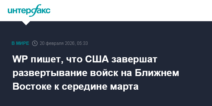 Москва. 20 февраля. INTERFAX.RU - США планирует завершить полное развертывание своих войск на Ближнем Востоке к середине марта, сообщает The Washington Post со ссылкой на осведомленные источники.