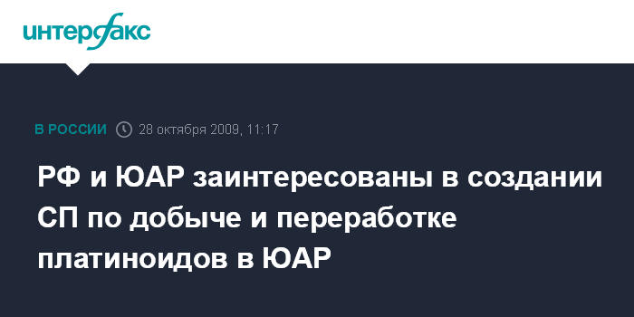 Москва. 28 октября. INTERFAX.RU – Россия и ЮАР заинтересованы в развитии проектов в области добычи и переработки металлов платиновой группы на территории Южно-Африканской Республики путем создания совместных предприятий, говорится в сообщении Минприроды России.