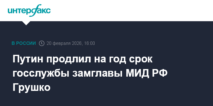Москва. 20 февраля. INTERFAX.RU - Президент России Владимир Путин своим распоряжением продлил до 25 апреля 2027 года срок федеральной государственной гражданской службы замглавы МИД РФ Александра Грушко.