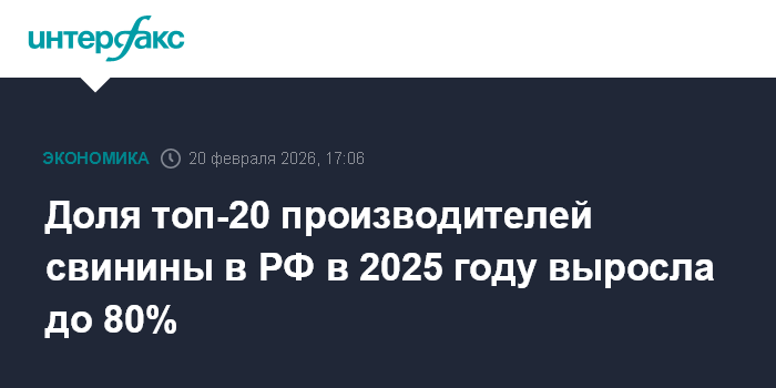 Москва. 20 февраля. INTERFAX.RU - Доля 20 ведущих производителей свинины в РФ в 2025 году составила 80% (4,73 млн тонн) в общем производстве, сообщается в рейтинге, составленном Национальным союзом свиноводов.