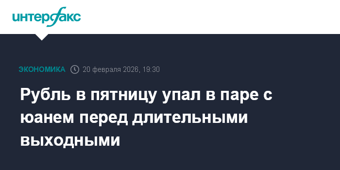 Москва. 20 февраля. INTERFAX.RU - Китайский юань вырос на Московской бирже по итогам торгов в пятницу. Рубль упал перед длительными выходными, а также с учетом снижения цен нефти и санкционных новостей. Торги проходили при сниженной активности, так как на уходящей неделе биржи Китая не работали из-за того, что в стране отмечают Новый год по лунному календарю.