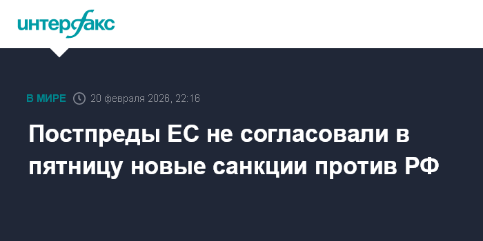 Москва. 20 февраля. INTERFAX.RU - Постпреды стран ЕС в ходе встречи в пятницу не смогли договориться о новом санкционном пакете против России, сообщают европейские СМИ.