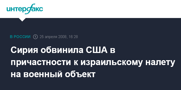 Дамаск. 25 апреля. INTERFAX.RU - Сирия выступила в пятницу с официальными обвинениями в адрес США, заявив, что эта страна причастна к налету израильской авиации на сирийский объект, который в Израиле и Вашингтоне назвали ядерным объектом.