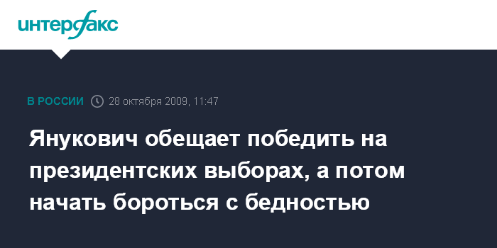 Москва. 28 октября. INTERFAX.RU – Лидер Партии регионов, кандидат в президенты Украины Виктор Янукович уверен в своей убедительной победе на предстоящих выборах. При этом он заявил, что его целью является наведение порядка в стране и победа над бедностью.
