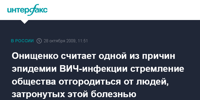 Онищенко считает одной из причин эпидемии ВИЧ-инфекции стремление общества отгородиться от людей, затронутых этой болезнью