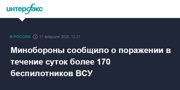 Москва. 21 февраля. INTERFAX.RU - Средства противовоздушной обороны в течение суток сбили управляемую авиабомбу, семь реактивных снарядов системы залпового огня HIMARS, пять крылатых ракет "Фламинго" и 172 беспилотных летательных аппарата самолетного типа, сообщили в Минобороны РФ в субботу.