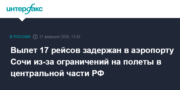 Москва. 21 февраля. INTERFAX.RU - Вылет 17 рейсов задерживается в аэропорту Сочи в связи с поздним прибытием рейсов из-за ограничений на полеты в центральной части РФ, сообщается в телеграм-канале аэропорта.