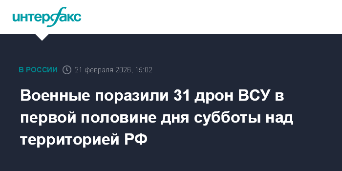 Москва. 21 февраля. INTERFAX.RU - Российские средства ПВО с 9:00 до 14:00 по Москве субботы перехватили и уничтожили 31 украинский БПЛА самолетного типа, сообщило Минобороны РФ.