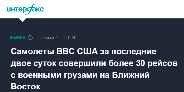 Москва. 22 февраля. INTERFAX.RU - Тяжелые военно-транспортные самолеты ВВС США продолжают активно доставлять военные грузы в регион Ближнего Востока, следует из данных авиационных ресурсов Flightradar24 и ADS-B Exchange.