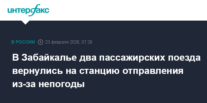 Москва. 23 февраля. INTERFAX.RU - Два пассажирских поезда вернулись на станции отправления в Забайкальском крае из-за сложных метеоусловий на одном из участков Транссиба, сообщает Забайкальская железная дорога (ЗабЖД, филиал ОАО РЖД).