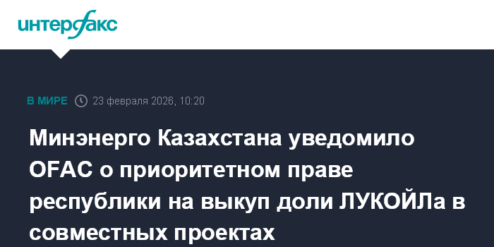 В конце января министр энергетики Казахстана Ерлан Аккенженов сообщил, что Казахстан отправил обращение в OFAC по вопросу о выкупе доли "ЛУКОЙЛа" в совместных проектах.