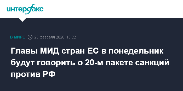 Главы МИД стран ЕС в понедельник будут говорить о 20-м пакете санкций против РФ