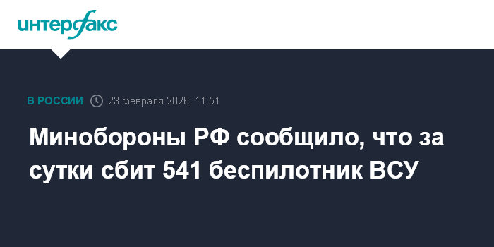 Москва. 23 февраля. INTERFAX.RU - Российские военнослужащие в течение суток сбили 541 украинский беспилотник самолетного типа, заявили в Минобороны России в понедельник.