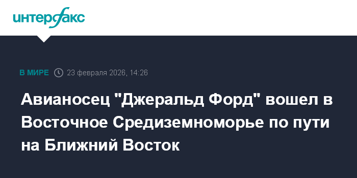 Москва. 23 февраля. INTERFAX.RU - Американский авианосец USS Gerald R. Ford в настоящее время идет по Восточному Средиземноморью к югу от Италии, направляясь на Ближний Восток, сообщила в понедельник газета The New York Times, ссылаясь на военные источники.