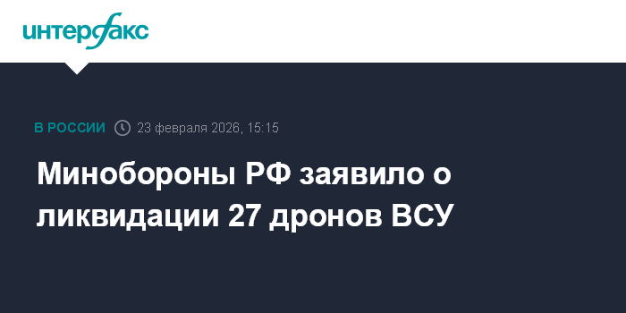 Москва. 23 февраля. INTERFAX.RU - Российские военнослужащие в период с 12:00 до 15:00 по московскому времени перехватили и уничтожили 27 украинских беспилотников самолетного типа, заявили в Минобороны РФ в понедельник.