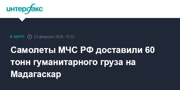 Москва. 23 февраля. INTERFAX.RU - Два спецборта МЧС РФ доставили 60 тонн гуманитарной помощи населению Магадаскара, пострадавшему от разрушительного тропического циклона "Гезани", сообщила пресс-служба министерства в понедельник.