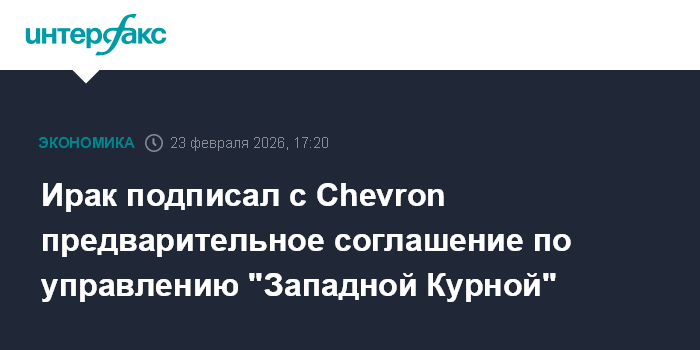 Москва. 23 февраля. INTERFAX.RU - Иракская Basra Oil подписала с американской Chevron предварительное соглашение о принципах передачи управления проектом месторождения Западная Курна-2, сообщает пресс-служба премьер-министра Ирака.
