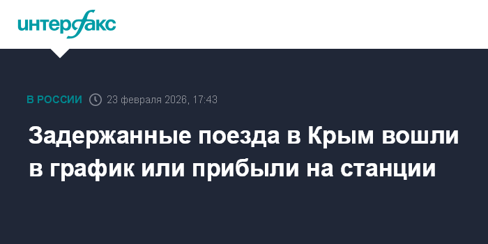 Москва. 23 февраля. INTERFAX.RU - Все поезда, следовавшие в Крым, вошли в график или прибыли на станции назначения, сообщила компания-оператор железнодорожных пассажирских перевозок в Крым и Севастополь "Гранд Сервис Экспресс" в своем телеграм-канале.