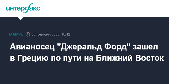 Москва. 23 февраля. INTERFAX.RU - Американский авианосец USS Gerald R. Ford в понедельник зашел в военно-морскую базу бухта Суда на греческом острове Крит, направляясь на Ближний Восток, сообщил местный новостной сайт Kriti360, публикующий фотографии корабля у причала.