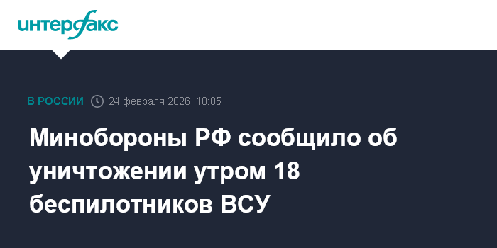 Москва. 24 февраля. INTERFAX.RU - Российские военные сообщили об уничтожении 18 украинских беспилотников самолетного типа в период с 7:00 до 9:00 мск над пятью регионами, а также Черным и Азовским морем.
