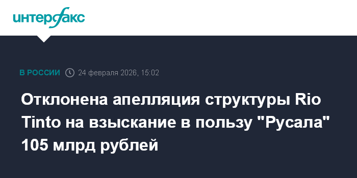 Москва. 24 февраля. INTERFAX.RU - Тринадцатый арбитражный апелляционный суд (Петербург) отклонил апелляцию компании RTA Holdco Australia 5 Pty Ltd, структуры горнодобывающей Rio Tinto, и оставил в силе решение Арбитражного суда Калининградской области о взыскании в пользу "Русала" 104,75 млрд рублей, сказано в базе данных арбитражных судов.