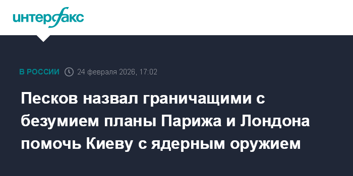 Москва. 24 февраля. INTERFAX.RU - Пресс-секретарь президента РФ Дмитрий Песков назвал граничащими с безумием планы Парижа и Лондона помочь Киеву получить ядерное оружие.