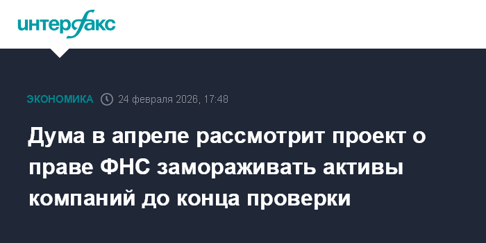 Москва. 24 февраля. INTERFAX.RU - Госдума в апреле рассмотрит "замороженный" с 2022 г. законопроект, разрешающий налоговым органам вводить обеспечительные меры в отношении имущества компаний и индивидуальных предпринимателей (ИП) еще в ходе налоговой проверки - до вынесения решения о доначислении налогов. Под ограничения могут подпасть недвижимость как производственного, так и иного назначения, транспортные средства, предметы дизайна служебных помещений, ценные бумаги.