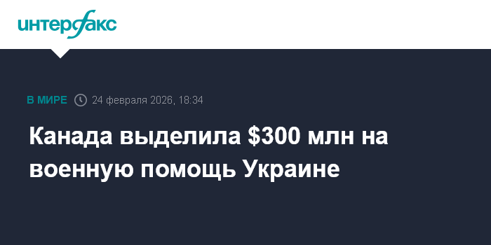 Москва. 24 февраля. INTERFAX.RU - Власти Канады заявили о выделении дополнительных $300 млн и новых военных поставках Украине, сообщает во вторник The Globe and Mail.