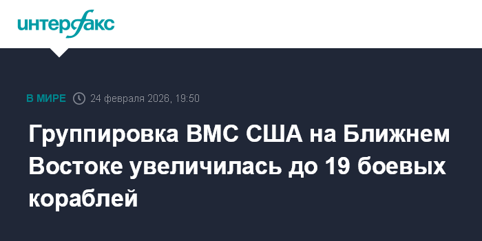 Москва. 24 февраля. INTERFAX.RU - Американская военно-морская группировка в зоне ответственности Центрального командования ВС США на Ближнем Востоке (CENTCOM) за последнюю неделю увеличилась с 13 до 19 боевых кораблей, сообщила информационная служба Военно-морского института Соединенных Штатов.