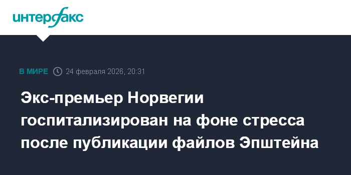 Москва. 24 февраля. INTERFAX.RU - Бывший премьер-министр Норвегии, бывший генсек Совета Европы Торбьёрн Ягланд госпитализирован после публикации документов финансиста Джеффри Эпштейна, сообщил Dagbladet его адвокат Андерс Бросвит.