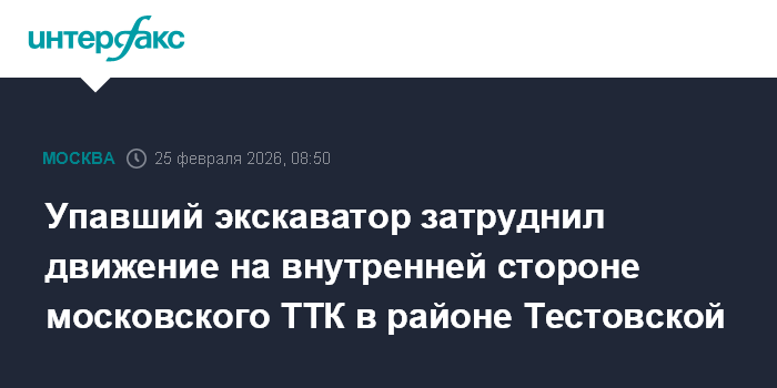Москва. 25 февраля. INTERFAX.RU - Движение транспорта затруднено на съезде с Третьего транспортного кольца (ТТК) на Тестовскую улицу из-за опрокидывания экскаватора, сообщили в столичной Госавтоинспекции.
