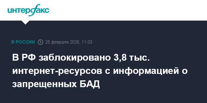 Москва. 25 февраля. INTERFAX.RU - По результатам подготовленных Роспотребнадзором решений в РФ заблокировано 3,8 тыс. интернет-ресурсов, распространяющих информацию о розничной продаже биологически активных добавок (БАД), реализация которых запрещена в России.