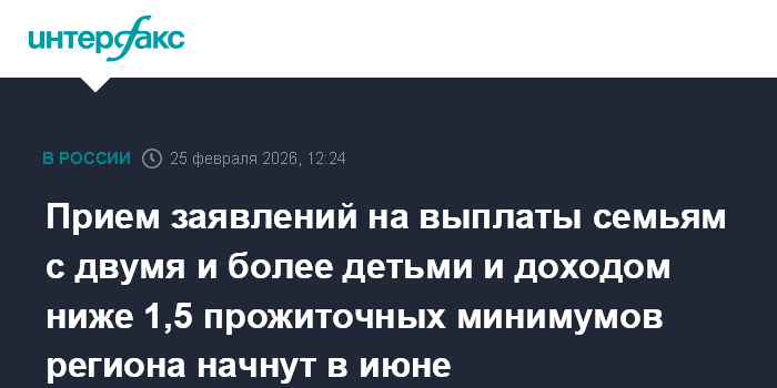 Москва. 25 февраля. INTERFAX.RU - Прием заявлений на ежегодную выплату семьям с двумя и более детьми, чей доход ниже полутора региональных прожиточных минимумов, начнется в июне 2026 года, заявил премьер РФ Михаил Мишустин.