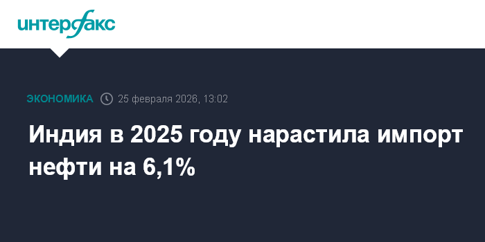 Москва. 25 февраля. INTERFAX.RU - Индия в 2025 году импортировала 262,47 млн тонн нефти - на 6,1% больше, чем в 2024 году, по статистике Министерства торговли. В денежном выражении поставки составили $138,84 млрд (-5,7% г/г).