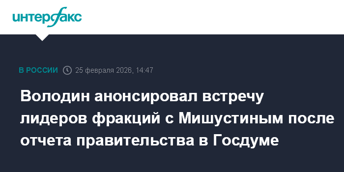 Москва. 25 февраля. INTERFAX.RU - Отдельная встреча премьера РФ Михаила Мишустина с лидерами фракций Госдумы пройдет в среду по завершении ежегодного отчета правительства перед парламентариями, сообщил председатель думы Вячеслав Володин.